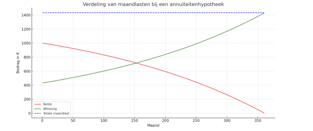 Een annuïteitenhypotheek is een lening waarbij je elke maand hetzelfde bedrag (de annuïteit) betaalt. Dit bedrag bestaat uit een deel rente en een deel aflossing. In het begin betaal je relatief veel rente en weinig aflossing, maar na verloop van tijd verschuift dit: het rentedeel neemt af en het aflossingsdeel neemt toe. Dit komt doordat je rente betaalt over het nog openstaande bedrag, en naarmate je aflost, daalt dit bedrag.
